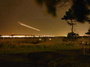 写真が、夜の羽田空港のILS装置に向かって飛行機が着陸してくる光。最高!! |