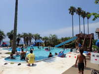 「キャンプサイトA」は、BBQエリアの背後に設置されているエリアでA,B,C,D,E,Fと6サイトがあります。これらのサイトからパーク内にある花畑をサイトから見ることができ景観の広がりが感じられるサイトです。屋内外プール用のトイレ、シャワー、更衣室が近いです。BBQエリアが前なので昼間は人通りが多いのですが気になるほどではありません。個人的には、花畑をサイト前にするほうが個人的にはおすすめだと思います。本エリアから見える高台にあるジャグルパークのヤシの木が南国の雰囲気をかもし出しています。 |